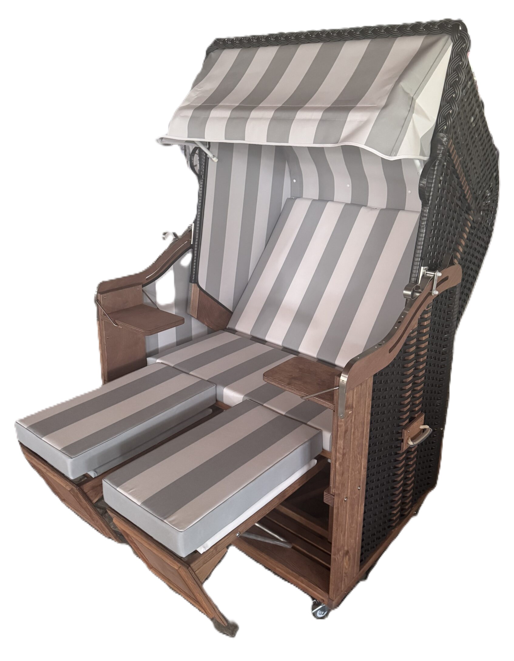 Der rechte Klapptisch bietet Platz für Zubehör, während die Zopfleiste an der Haube den klassischen Strandkorb-Charakter bewahrt. Kein Aufbau nötig: Wir liefern den Korb fertig montiert und versandkostenfrei direkt zu Ihnen (DE Festland).